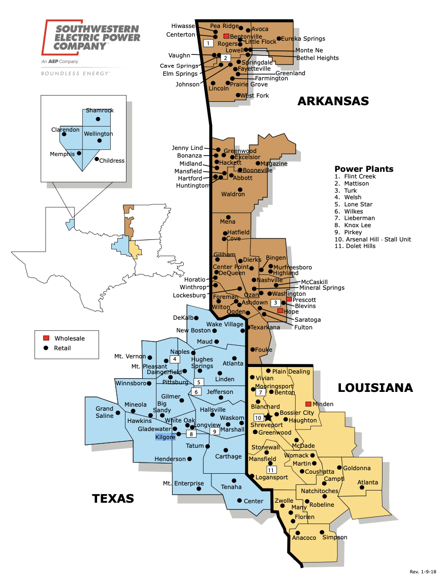 Southwestern Electric Power Company serves 556,100 customers in northwestern and central Louisiana, western Arkansas, East Texas and the Panhandle area of North Texas. Its headquarters are in Shreveport, La.